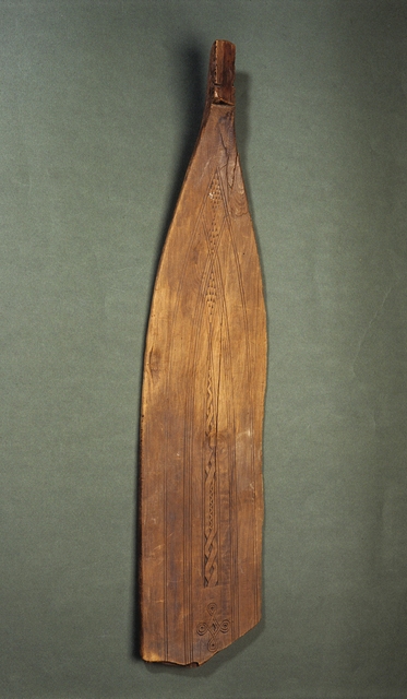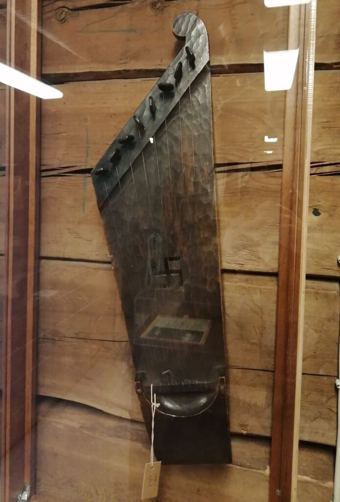 Viikinkiajan suksi jossa alhaalla näkyvissä hannunvaakuna ja kantele vuodelta 1903