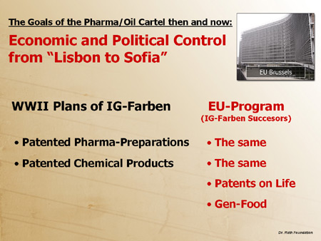 Euroopan Unioni on toteuttanut IG Farbenin suunnitelmat lähes sellaisenaan, tosin lisäämällä siihen ruokapatentit ja yleiset ”elämää koskevat patentit”, mitä ne sitten lienevätkään. Sitä jokainen voi miettiä itsekseen omalta osaltaan. Ainakin IG Farbenin tavoitteena on geenien patentointi ja hallinta, sekä GMO-patentit. Juuri siksi saksalaiset ostivat hiljattain amerikkalaisen GMO-jätin Monsanton. Myös molekyylien patentointi on asialistalla. Tylsiä juttuja, paitsi että meidän koko elämämme on pelissä.
