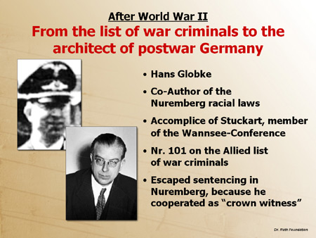 Hans Globke, joka oli liittoutuneiden natsirikollisten listalla numero 101, mutta jätettiin Nürnbergin oikeudenkäynnissä tuomitsematta, koska toimi liittoutuneiden vasikkana ja todistajana, oli sodan jälkeisen Länsi-Saksan johtajia. Globke oli Konrad Adenauerin hallinnon ministerinä vuosina 1949-63. Globke oli yksi natsien rotulakien kirjoittajista ja Lopullisen ratkaisun kehittäneessä Wannaseen konfrenssissa mukana olleen Wilhelm Stuckartin avustaja.