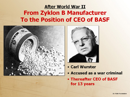 Suuri osa tuomituista IG Farbenin johtajista vapautui kuitenkin pikapikaa sotarikosvankeudesta tuomioista riippumatta. Carl Wurster, joka oli sodan aikana vastannut nimenomaan kaasukammioissa käytetyn Zyklon B;n valmistamisesta ja toimittamisesta, oli pian BASF:in toimitusjohtaja ja jatkoi siinä asemassa peräti 13 vuotta. Frits ter Meer, joka oli tuomittu Auschwitzissa toimeenpannuista kansanmurhasta ja orjuuttamisesta vapautui hänkin pian sodan jälkeen ja toimi Bayernin toimitusjohtajana vuosikymmenen ajan.